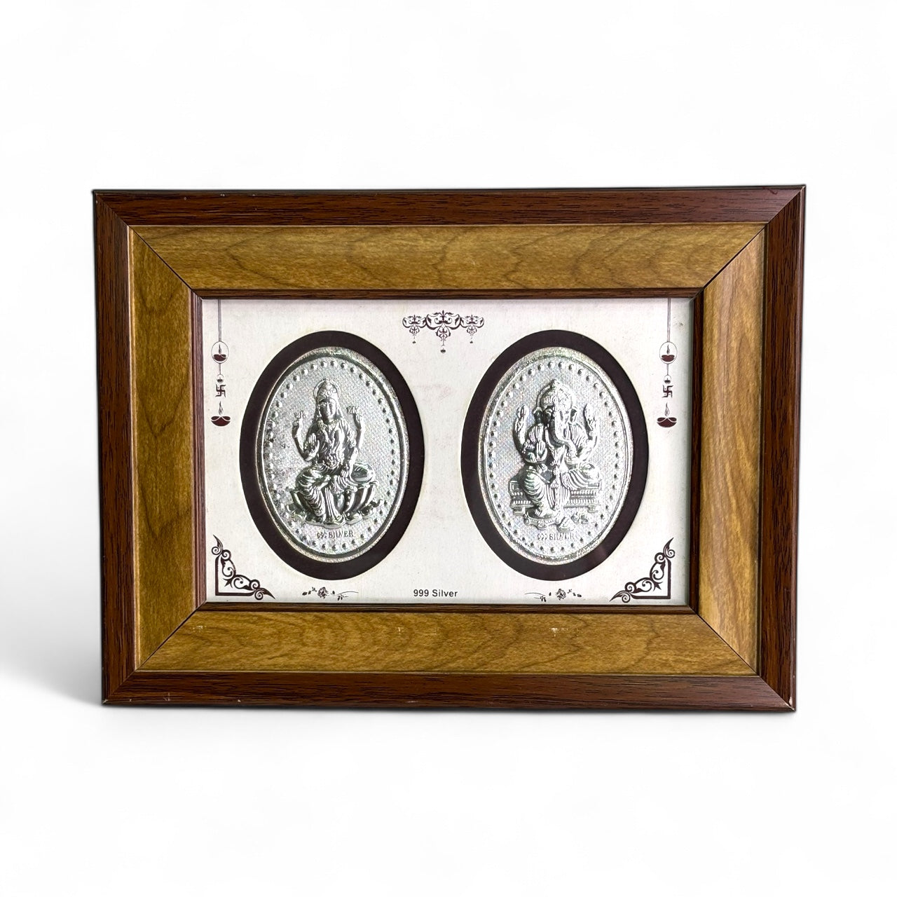 Celebrate the divine blessings of Diwali with the Sacred Silver Lakshmi Ganesh Frame, crafted with pure 999 silver idols of Goddess Lakshmi and Lord Ganesha beautifully set in an elegant wooden frame. This masterpiece blends tradition with artistry, making it an auspicious addition to your home or a thoughtful festive gift. The idols are intricately detailed, symbolizing prosperity, wisdom, and positive energy, while the frame’s classic wooden finish enhances its premium appeal.