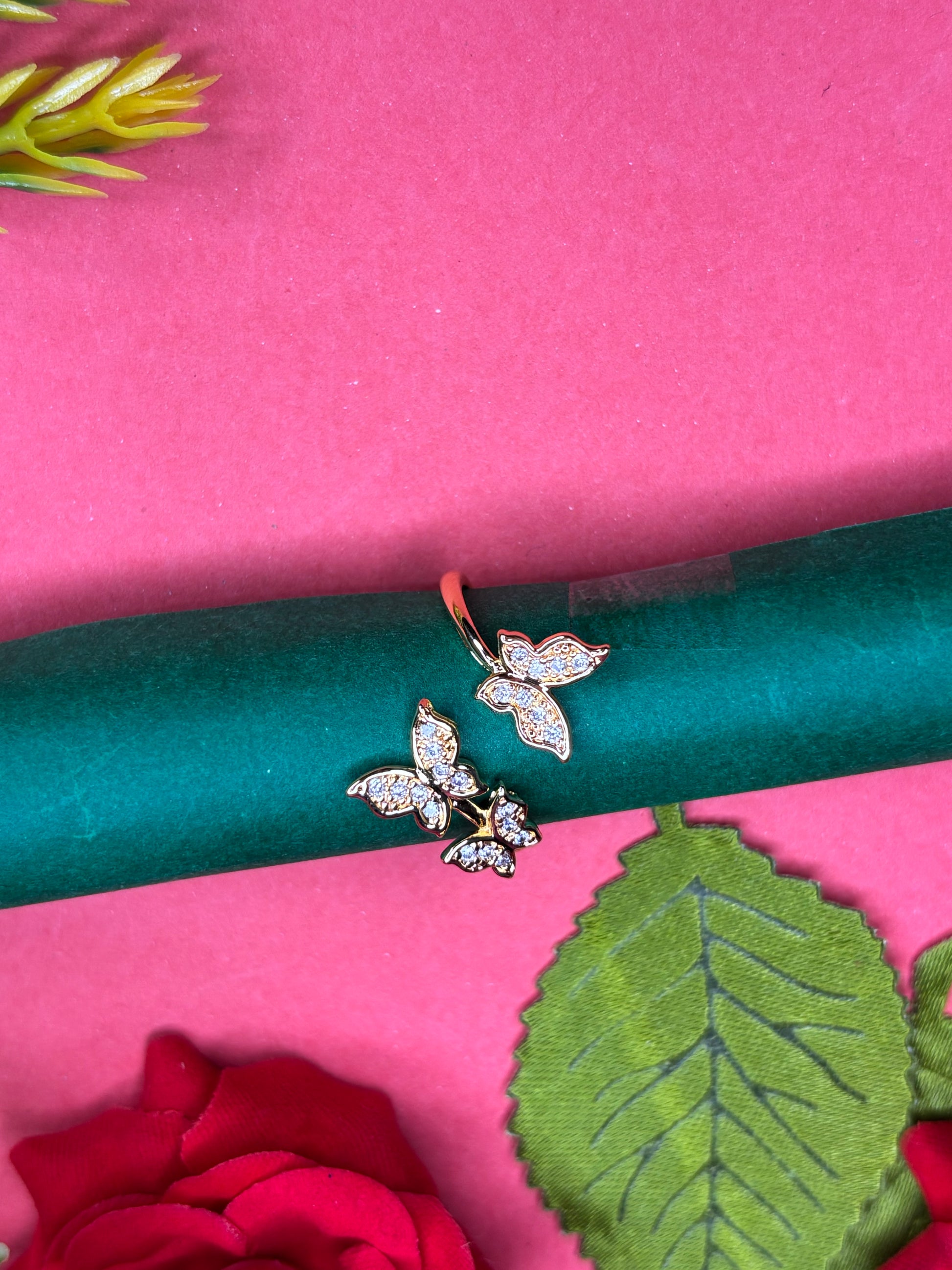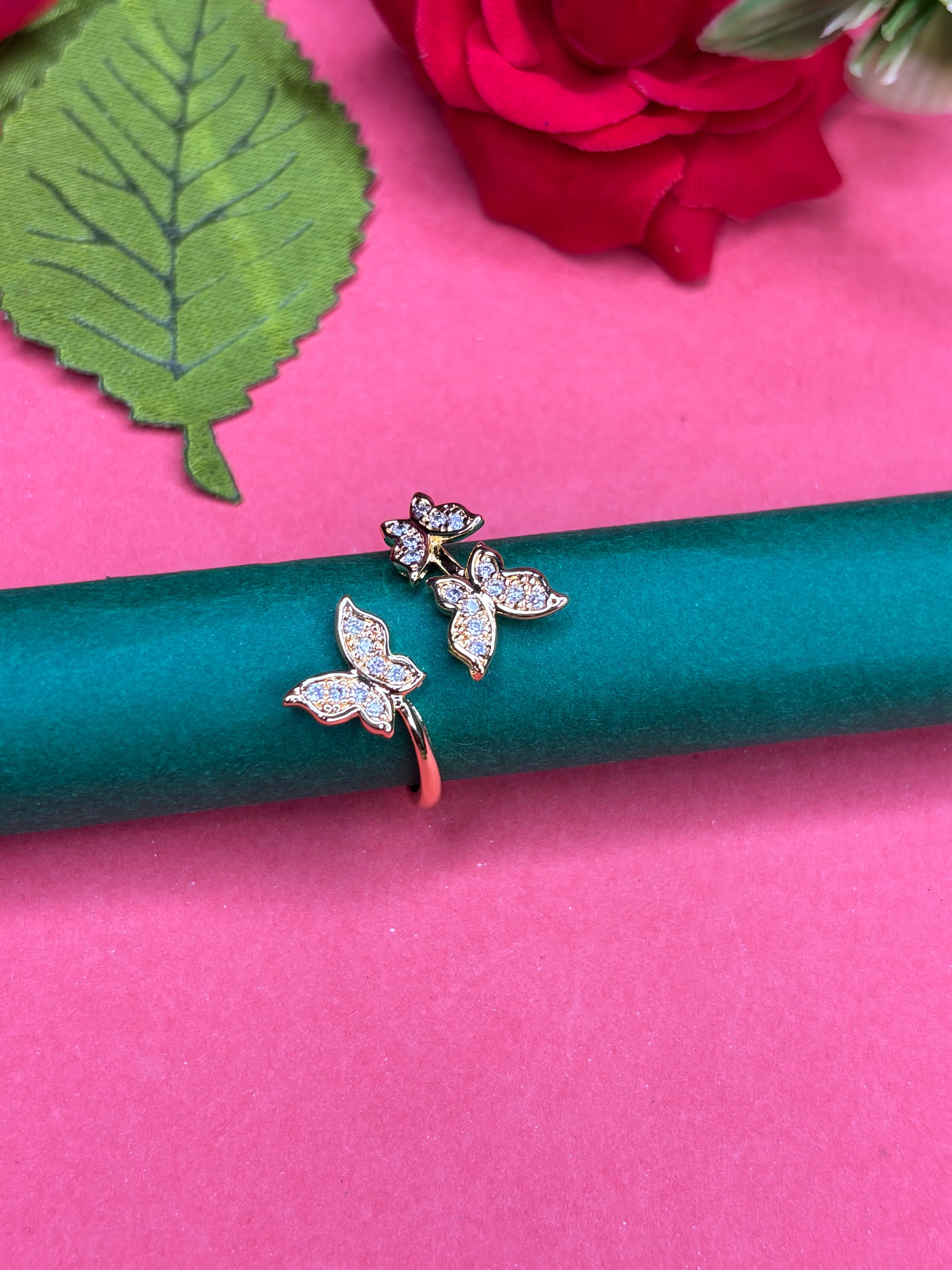The Butterfly Bloom Adjustable Ring is a graceful open-ended design crafted from premium anti-tarnish metal with a warm rose-gold finish. Adorned with three shimmering, zircon-studded butterflies, it captures the light beautifully and adjusts to fit comfortably on any finger. Resistant to dullness, this ring retains its glow for years, offering elegance with zero maintenance.