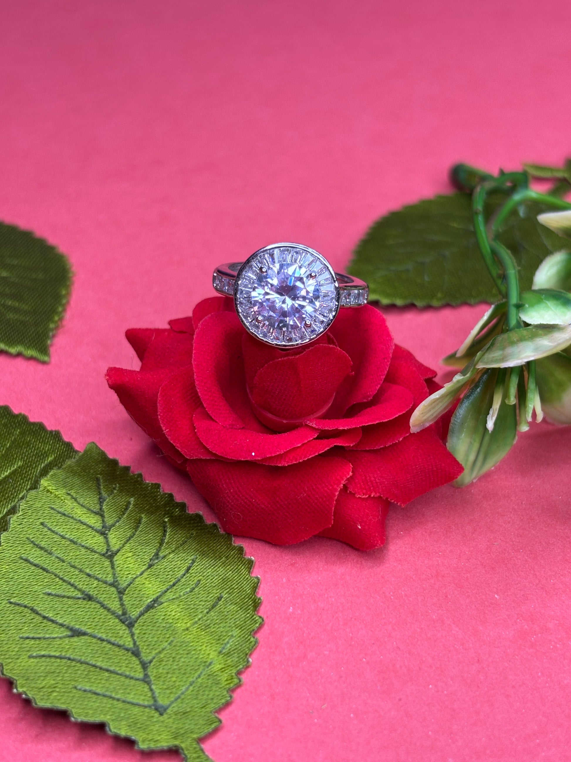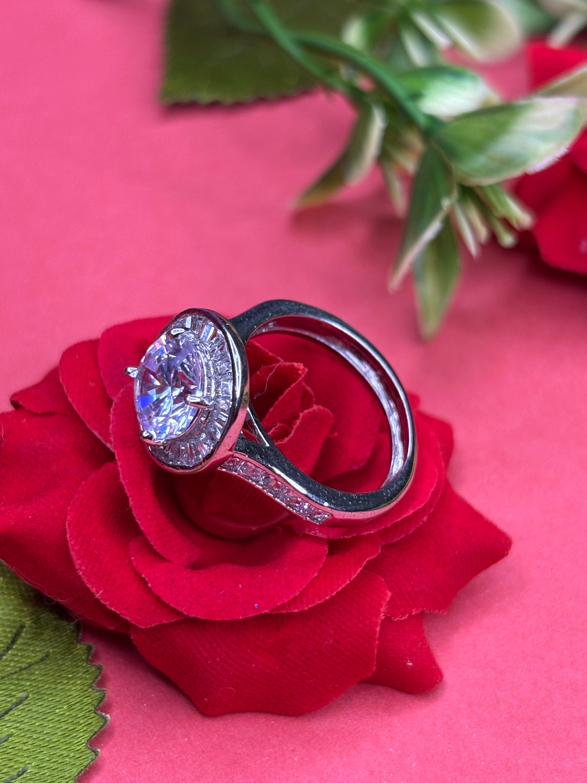 The Celestial Crown Solitaire Ring features a brilliant oval-cut zircon centerpiece, encircled by a halo of shimmering stones for maximum brilliance. The band, crafted from premium anti-tarnish metal with a sleek rhodium finish, is further adorned with channel-set zircons for added sparkle. Designed for durability and shine, it’s a ring that stays radiant wear after wear.
