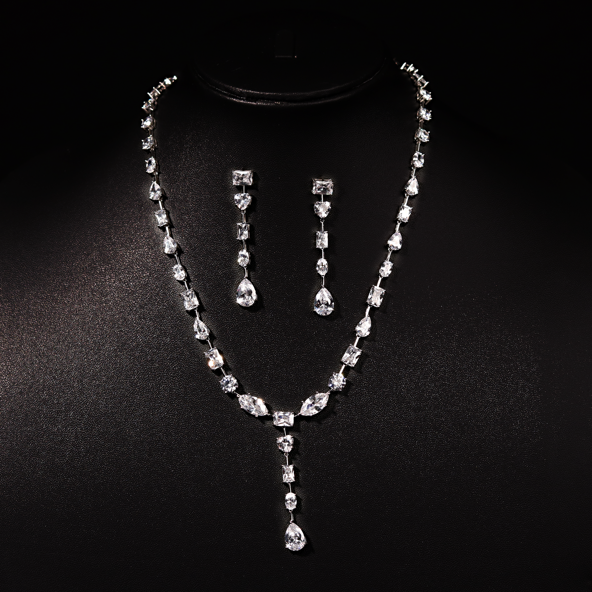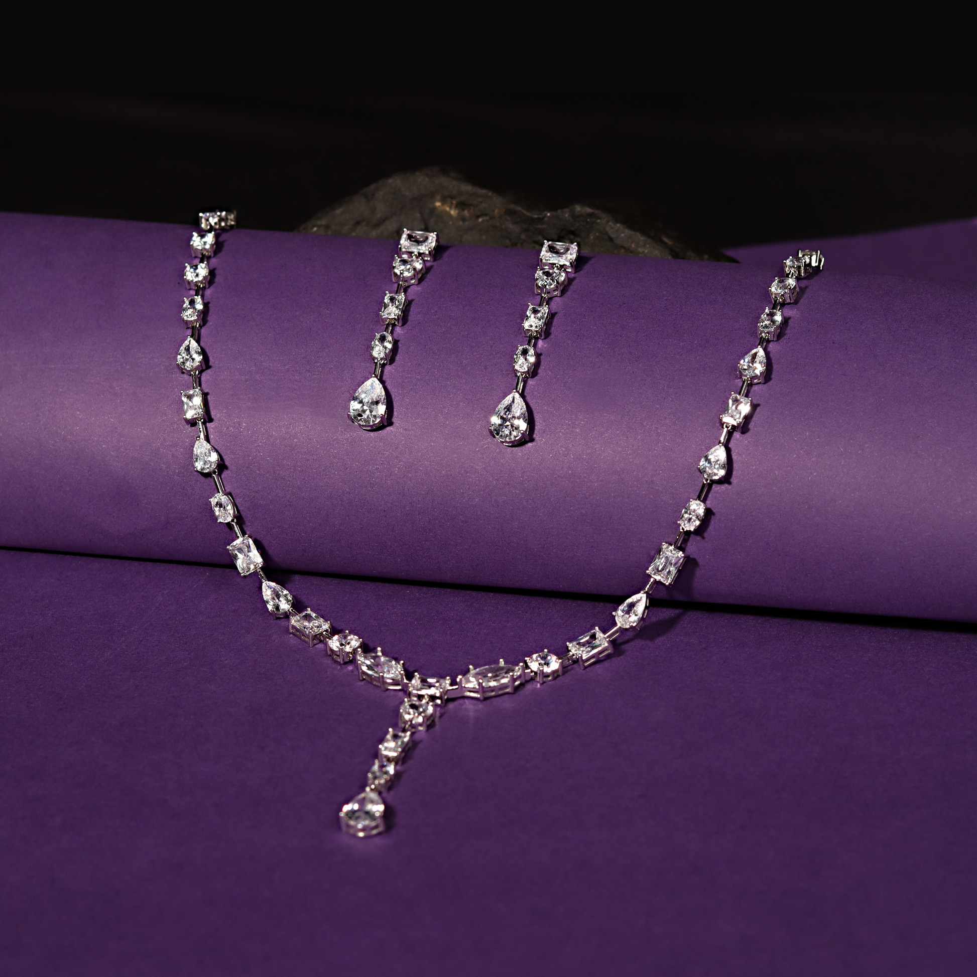 This 925 sterling silver tennis necklace and earring set by Viqso Jewels features meticulously set AAA+ zircon stones that offer unmatched sparkle and refinement. The continuous row of round-cut zircons on the necklace and the matching drop earrings create a cohesive, elegant aesthetic, perfect for both formal events and daily wear. Each piece is designed to ensure lasting beauty, making it a staple in your jewelry collection.
