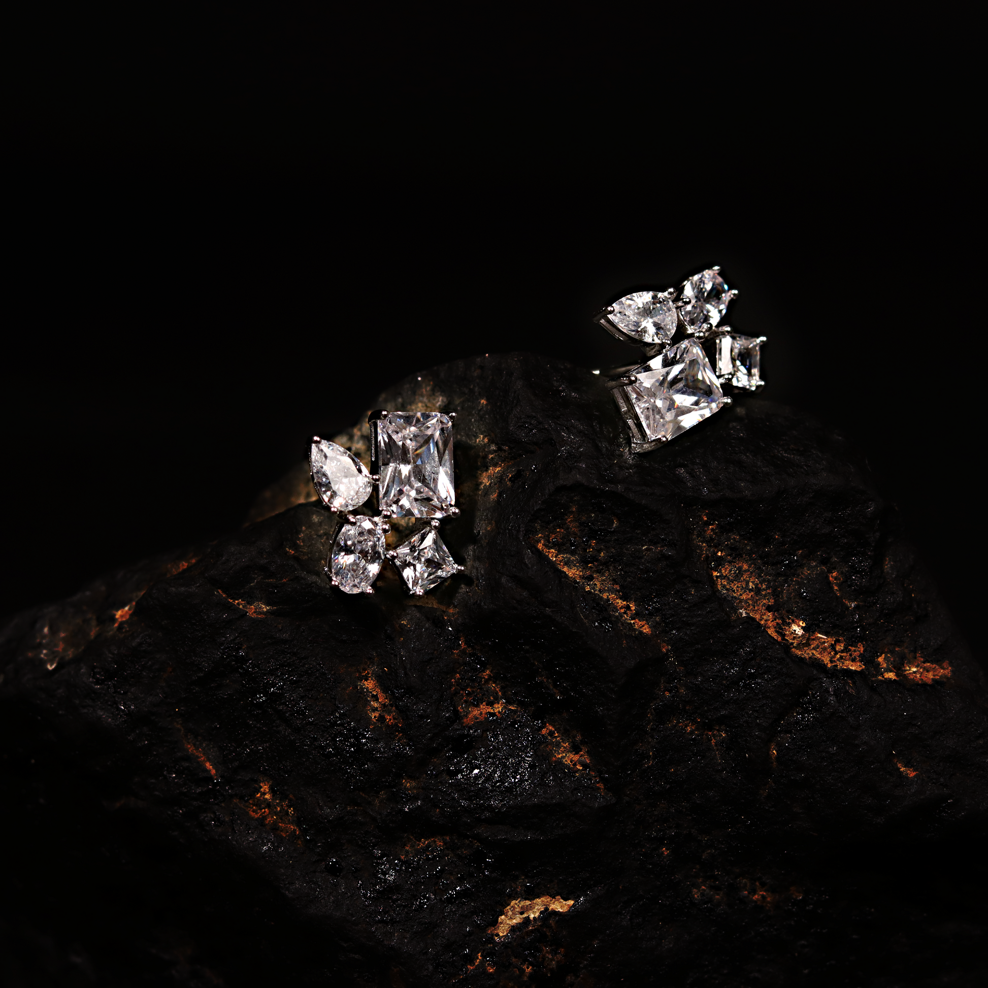 Inspired by modern sophistication and artistic flair, these multi-cut cluster earrings are designed for those who appreciate unique and bold jewelry. The blend of various zircon cuts—pear, rectangular, and round—creates a captivating piece that combines classic charm with contemporary style.