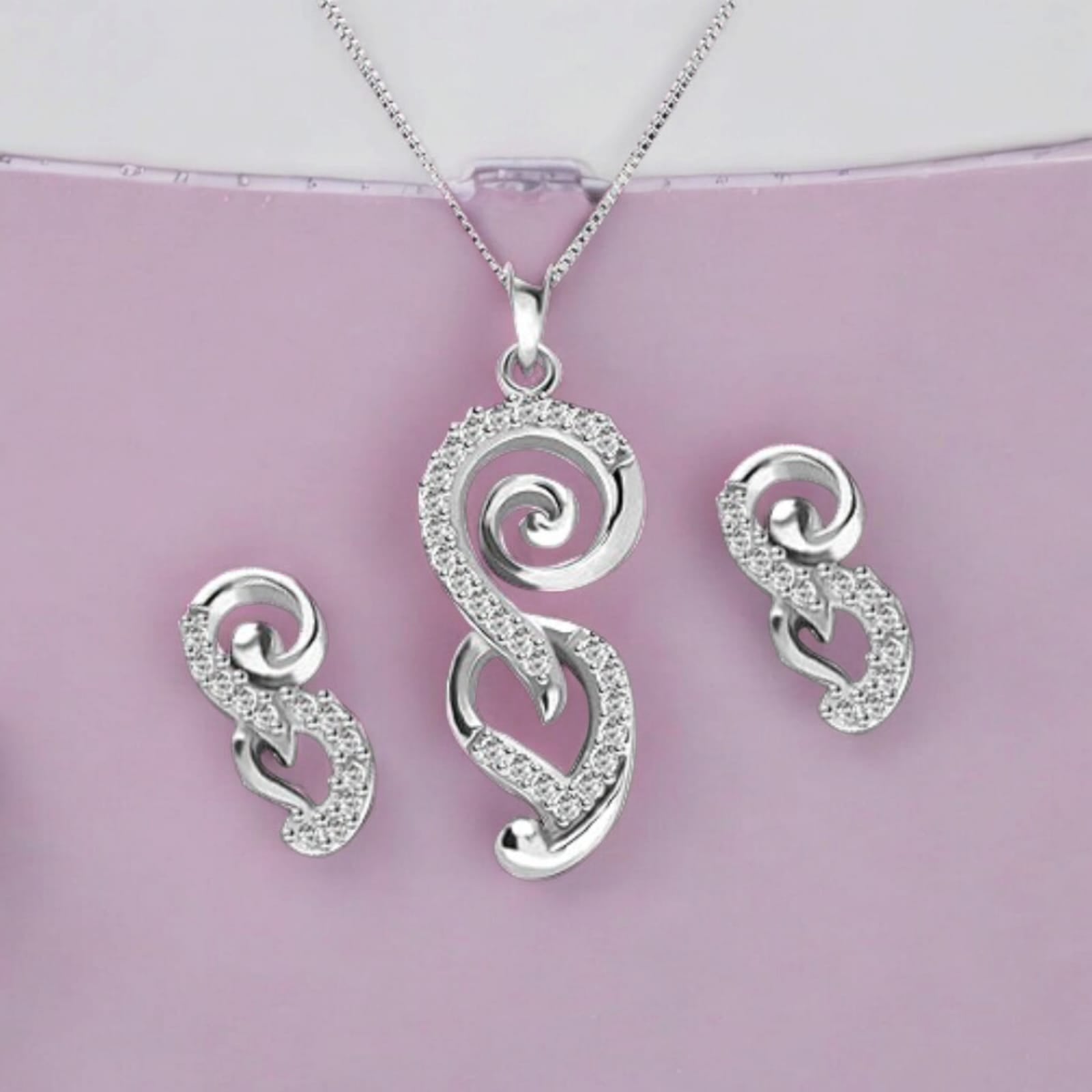 Crafted with precision from 925 sterling silver, this swirl pendant set from Viqso Jewels includes a pendant and matching earrings, designed to bring out your inner elegance. The delicate swirl design is encrusted with shimmering stones, giving it a luxurious yet understated appeal. A perfect blend of sophistication and modernity, this set is ideal for any occasion.