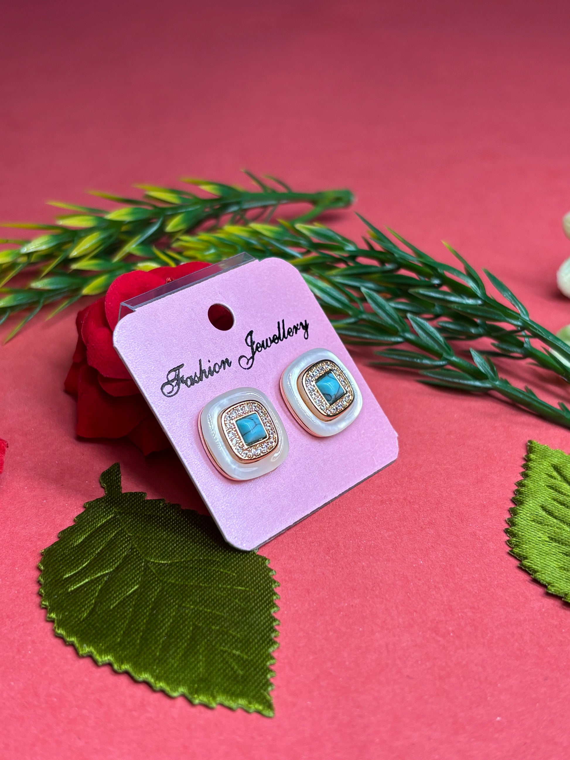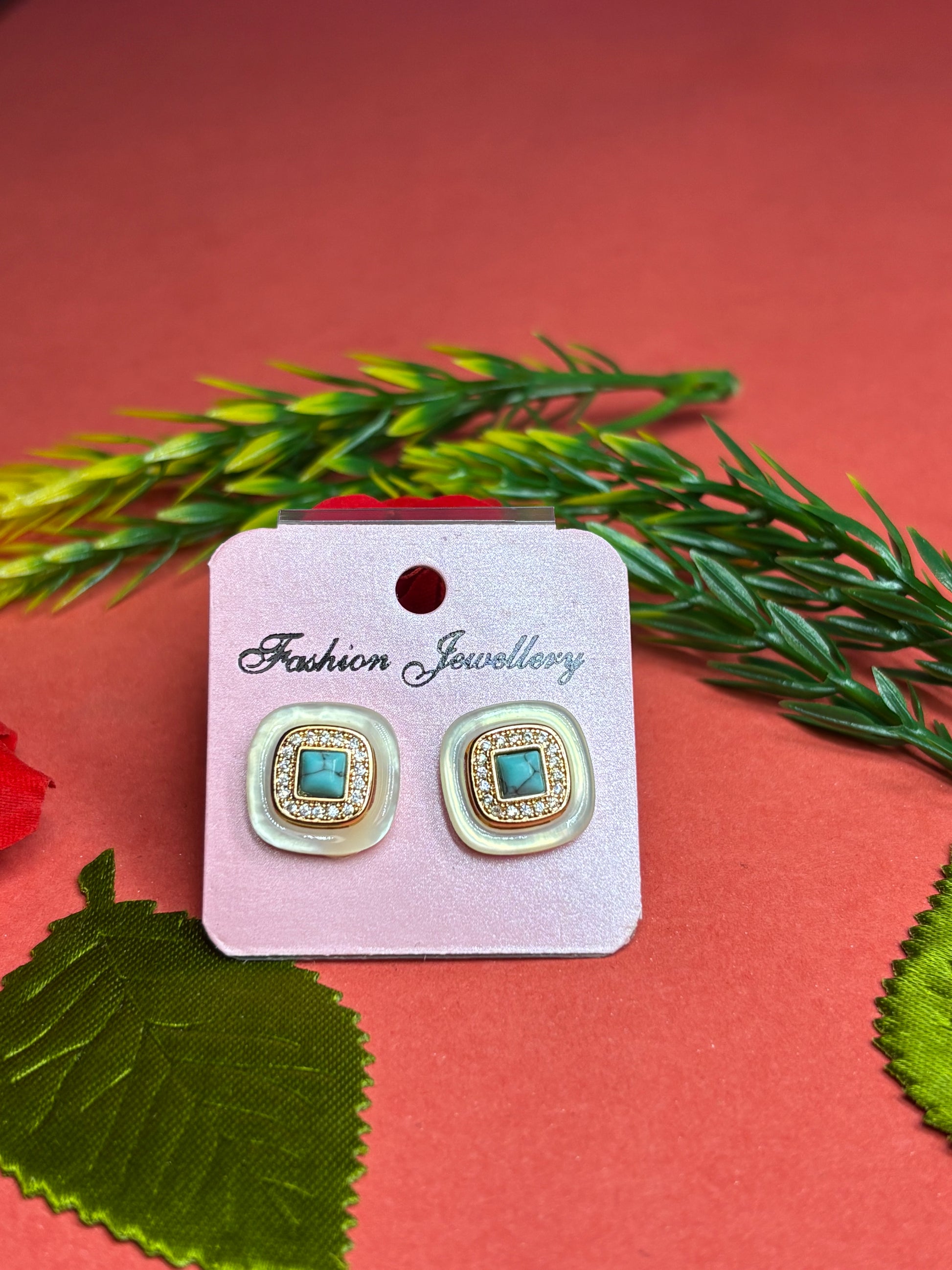 The Turquoise Glow Studs feature a captivating square-cut turquoise stone at the center, framed by a halo of shimmering crystals and encased in a soft pearlescent border. Crafted from stainless steel with an anti-tarnish finish, these studs combine durability with elegance, making them a versatile accessory for both modern and traditional outfits.