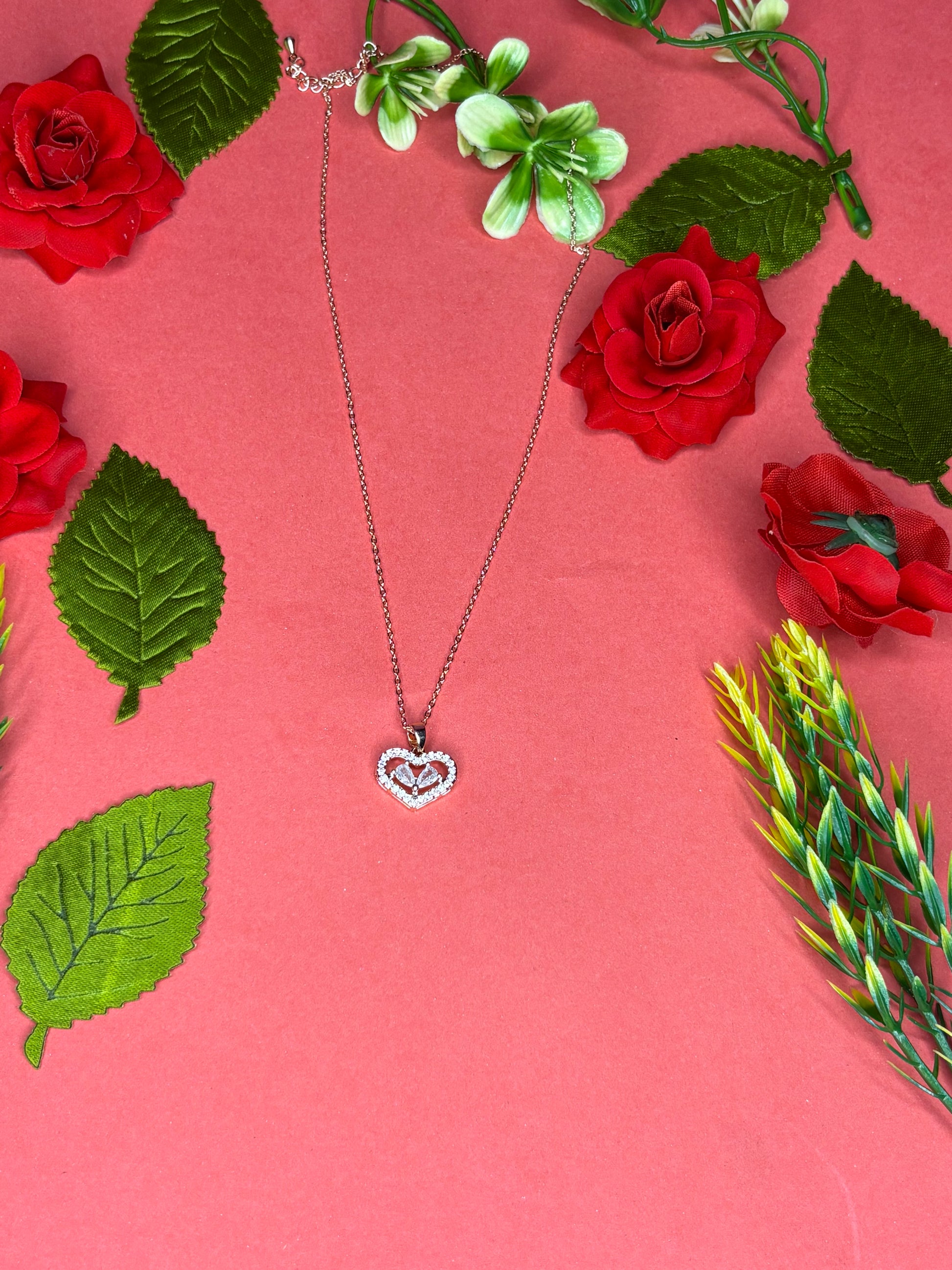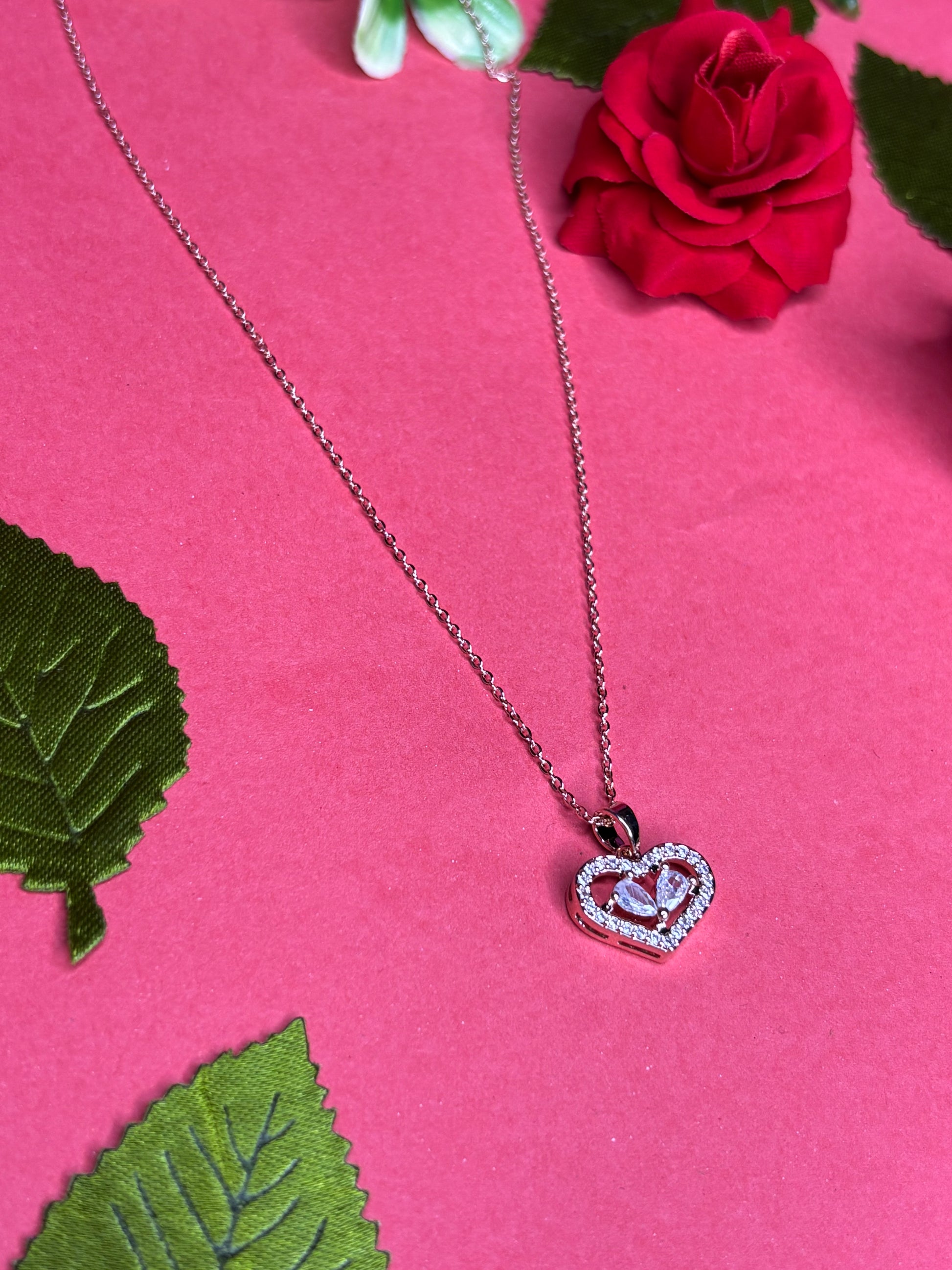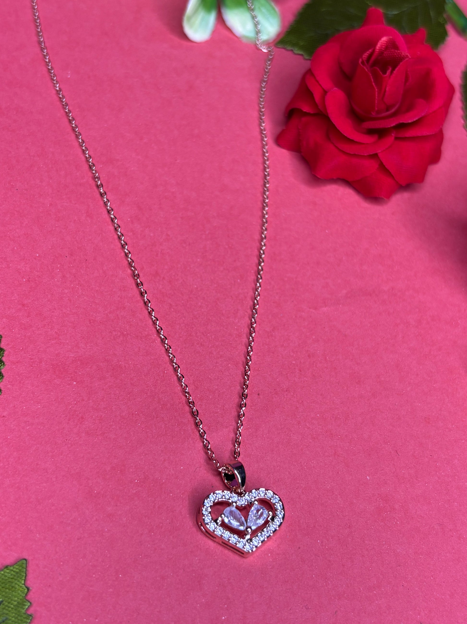 Crafted from premium anti-tarnish metal and plated in a radiant rose-gold tone, the Twilight Embrace Heart Pendant features a hollow heart frame encrusted with dazzling zircon stones. At its center, two heart-shaped stones — symbolizing two souls connected — sparkle with unmatched brilliance. Designed for long-lasting beauty, this pendant stays untarnished and luminous, making it a perfect everyday statement of love.