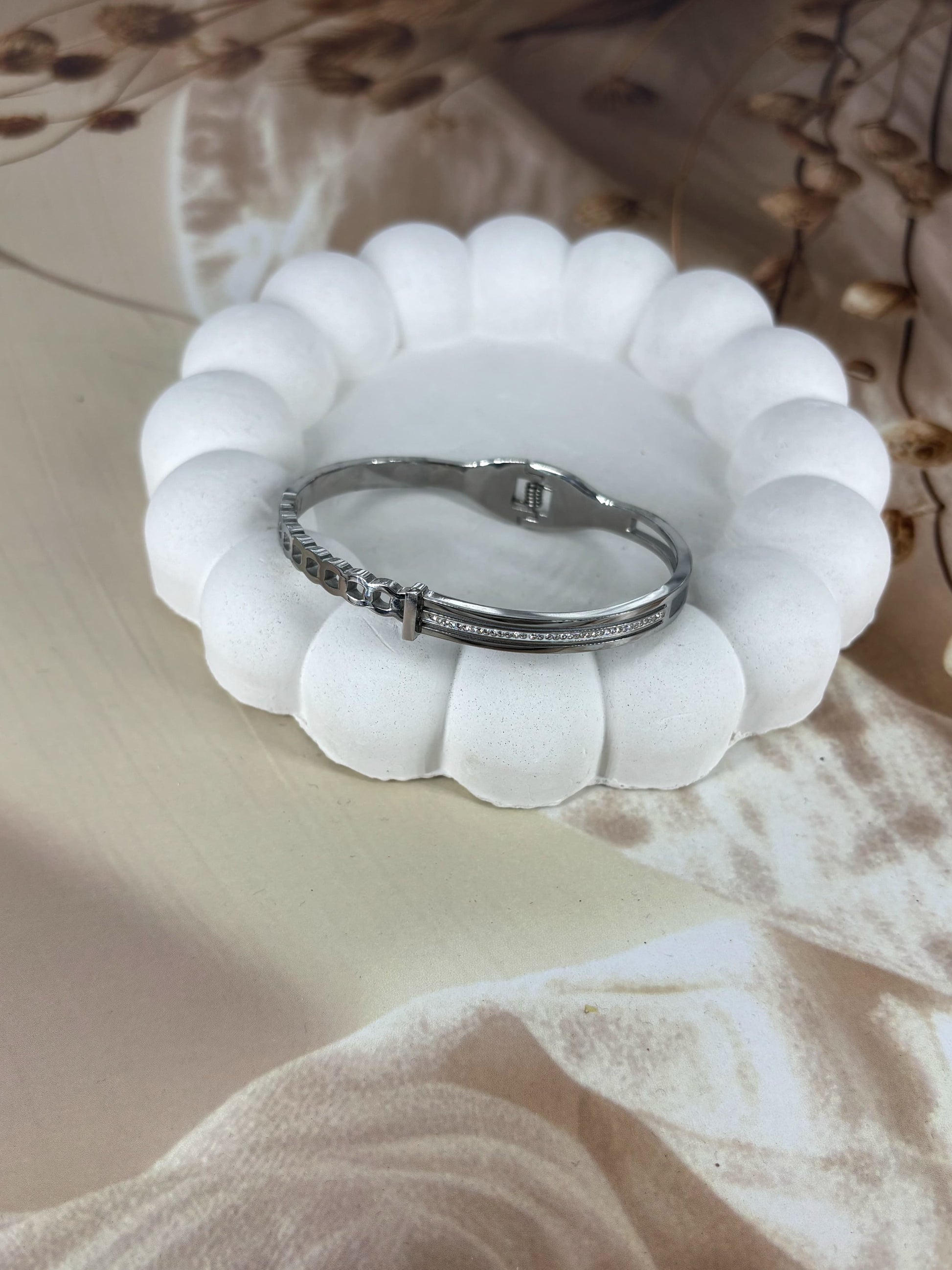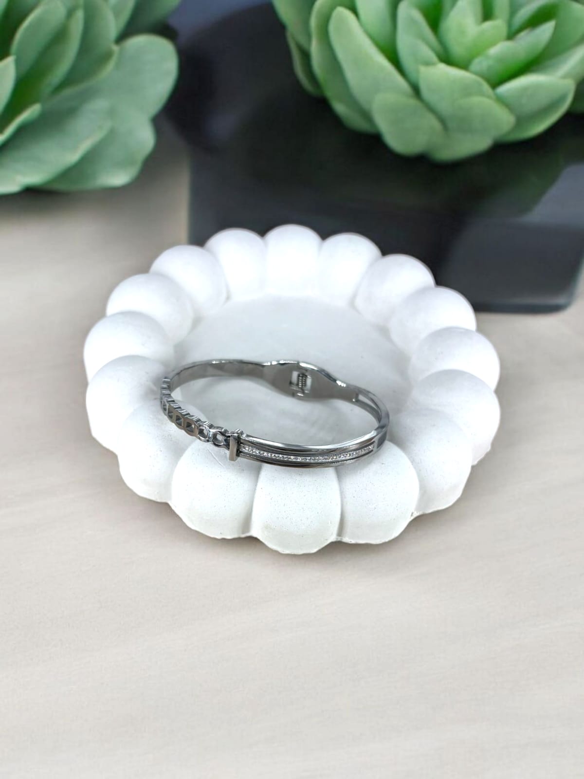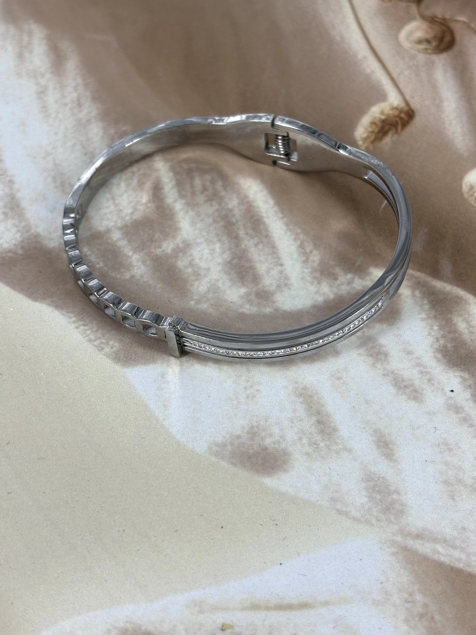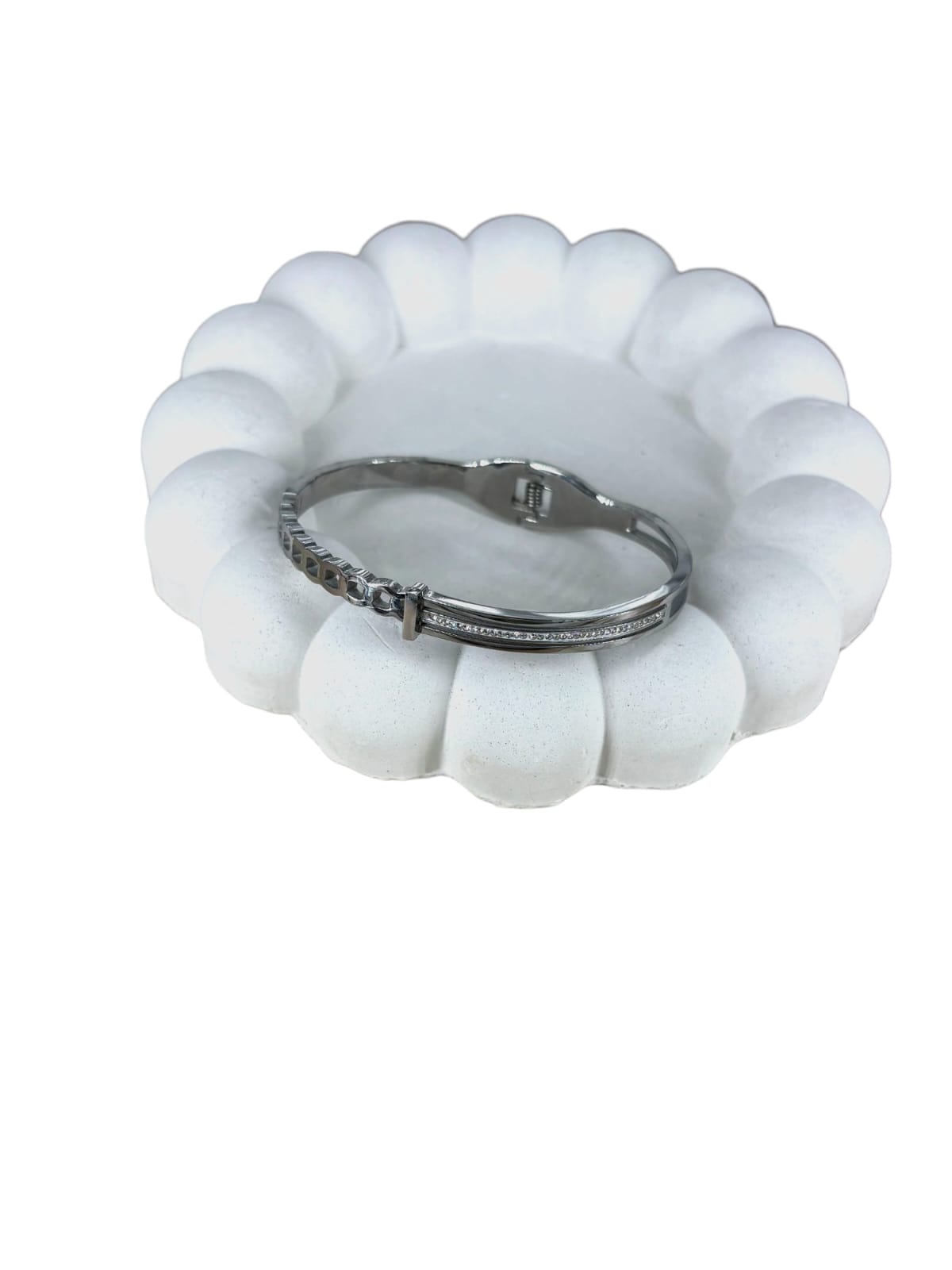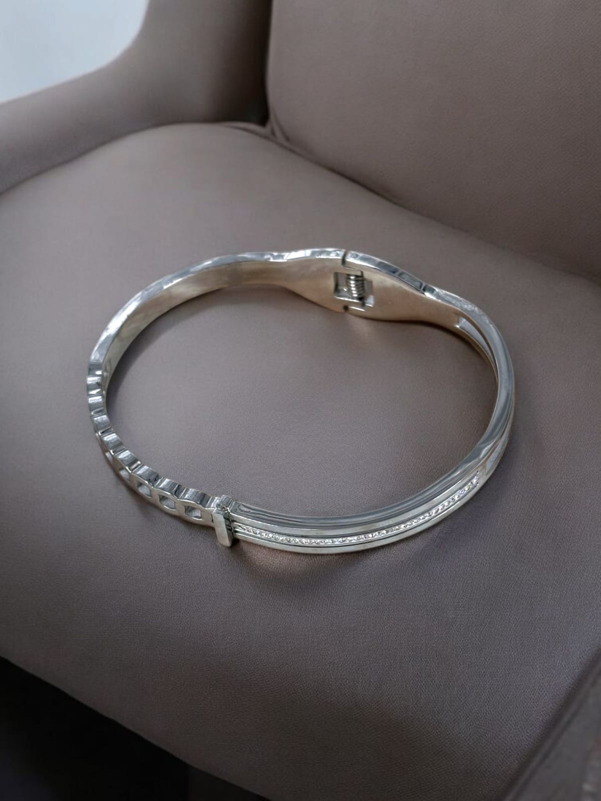 The Viqso Celestia Cuff is an ultra-sleek silver-tone stainless steel bracelet that radiates minimalist luxury. Featuring a clean silhouette with a line of micro-set zircon stones and subtle hammered textures, this piece reflects light like stardust on your wrist. Built for elegance and endurance, it's an everyday essential that transitions flawlessly from day to night.