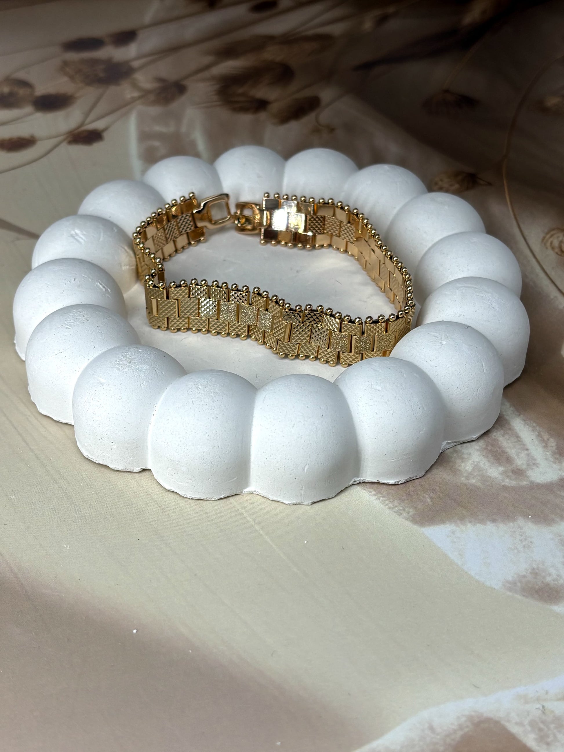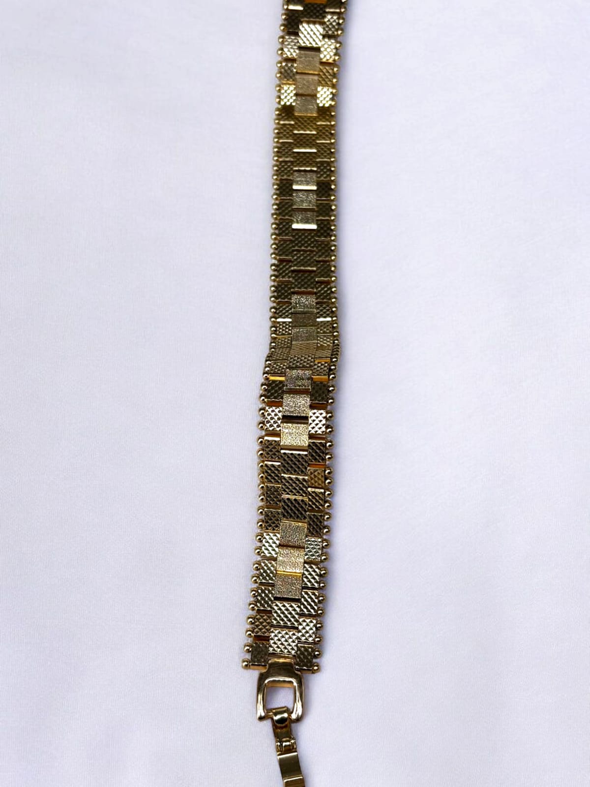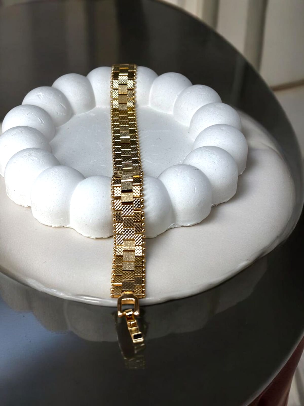 The Viqso Gridforce Luxe bracelet showcases a bold architectural layout of textured square links, polished in golden stainless steel with a matte-meets-gloss finish. Each tile is precision-cut with micro detailing, forming a bracelet that feels like wearable armor — lightweight, corrosion-resistant, and impossible to ignore.