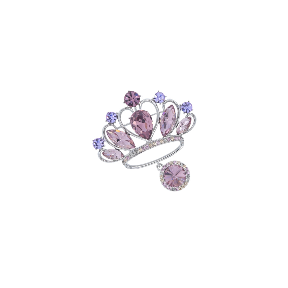 The Viqso Royal Crown Brooch is an elegant piece crafted from premium stainless steel, designed to embody royalty and grace. It features a crown motif adorned with delicate pink and lavender gemstones, complemented by a dangling crystal charm for added movement and sparkle. The polished silver-tone finish enhances the vibrant hues, making it a standout accessory.